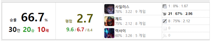 또한 최근 30번의 경기에서도 최근 경기 동안의 컨디션은 어떤지를 보여주며 승률도 상당히 높고 미드와 정글을 번갈아가며 하고 있지만 둘 다 좋은 폼을 보여주고 있습니다!!!